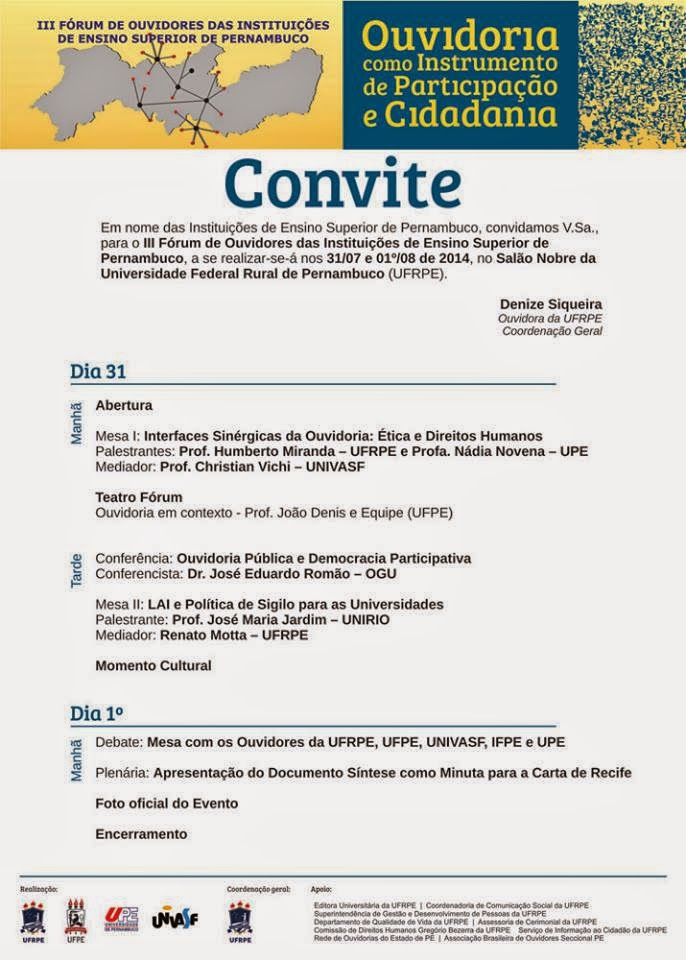O III FÓRUM DE OUVIDORES DAS INSTITUIÇÕES DE ENSINO SUPERIOR DE PERNAMBUCO que ocorrerá no Campus de Dois Irmãos na UFRPE, contará com a participação do Professor José Maria Jardim (UNIRIO) e do Arquivista Renato Motta Rodrigues da Silva (UFRPE).